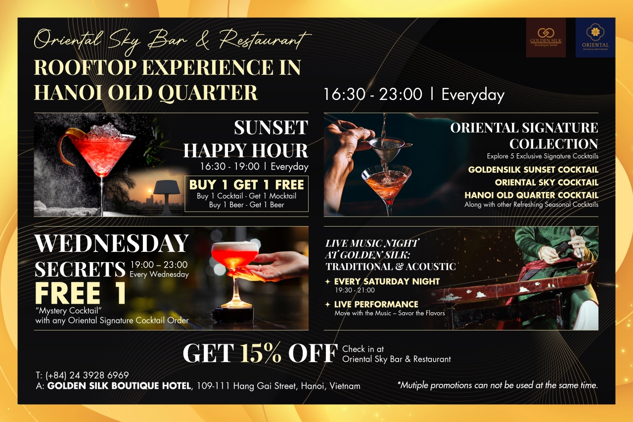 Enjoy Hanoi’s golden hour with our exclusive Happy Hour program: Buy 1 Get 1 Free